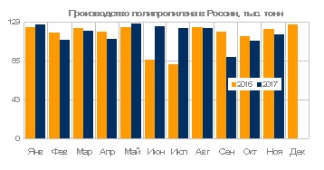 Производство полипропилена в 2016 году не превышал 1млн. 251тыс. тонн, тогда как за неполный 2017 год объём выпуска значительно превысил прошлогодний показатель. Предприятия Томскнефтехим и СИБУР Тобольск увеличили объёмы производства, в то время как на «Нефтехимии», Нижнекамскнефтехиме и Ставролене наблюдалось падение выпуска продукции. Только за ноябрь производство Российского полипропилена составило 115 000 тонн, что демонстрирует существенный прирост по сравнению с 108 000 тыс. тонн за октябрь того же года.
