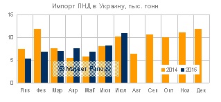В июле количество импортируемого ПНД повысилось до 10,9 тысяч тонн, когда как в июне было 8,3 тысяч тонн. Такое повышение объясняется увеличением количества импортируемого литьевого ПНД предприятиями производящие крышки тары из ПЭТ. Анализ семи месяцев показал, что импортируемый ПНД претерпел спад до 52,6 тысяч тонн в отличие от 56,3 тысяч тонн в 2014 году. Значительный спад спроса относится именно на ПЭ для формования экструзионно-выдувным методом.