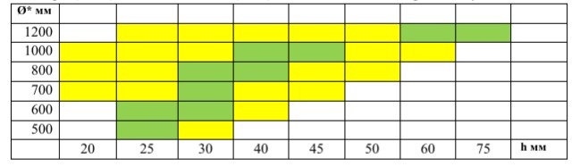 В соответствии с требованиями нагрузки данные модули могут выполняться и большим водоизмещением в диаметрах 700, 800, 1000 и 1200 мм с пропорциональным увеличением толщины стенки. В нижеприведенной таблице указаны производимые диаметры (Ш мм) и толщины стенок (h мм), как возможные, так и рекомендуемые.